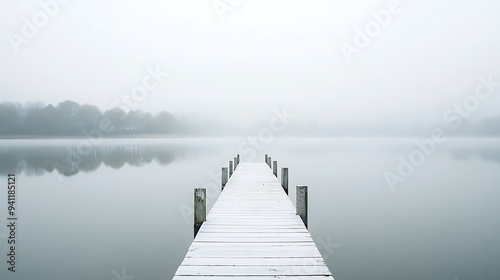 © Keattipoom, Fototapeta premium Serene White Pier Extending into Still Lake with Minimalistic Reflections