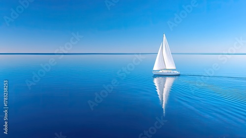© arsya, Obraz premium Serene White Sailboat Gliding Across Calm Blue Ocean Under Clear Sky with Ripples and Reflection