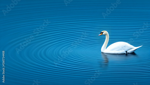 Obraz premium Serene white swan gliding on calm blue water, creating concentric ripples
