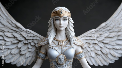© David, Obraz premium Serene White-Winged Female Deity in Pristine Armor with Golden Embellishments, Representing Purity, Divinity, and Tranquility