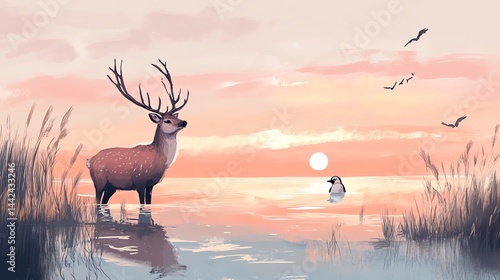 © Kittivon, Fototapeta premium Serene wildlife scene at sunset, deer and duck.