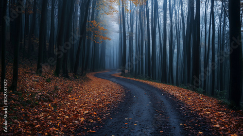 © nuupucca, Fototapeta premium Serene winding forest path in autumn mist