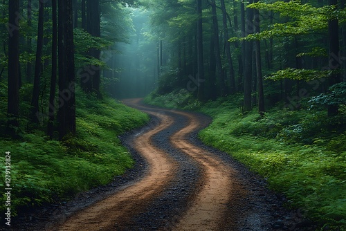 Fototapeta premium Serene Winding Forest Path in Misty Woods