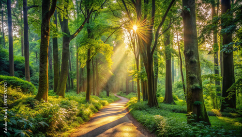 © Adisorn, Obraz premium Serene winding forest path surrounded by towering trees and lush greenery, dappled with warm sunlight, invites exploration and connection with nature's tranquility.