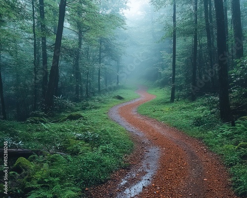 Fototapeta premium Serene winding path through a misty forest with lush greenery and tranquility