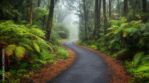 © Adi, Fototapeta premium Serene winding path through lush green forest with misty atmosphere and vibrant foliage