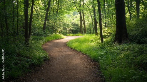 Naklejka premium Serene winding path through lush green summer forest trees day way walk park...