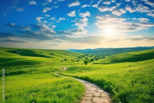 Fototapeta premium Serene Winding Pathway in Lush Green Countryside Generative AI
