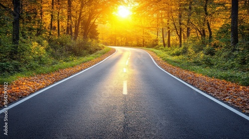 © novitasary, Fototapeta premium Serene winding road through a sunlit autumn forest.