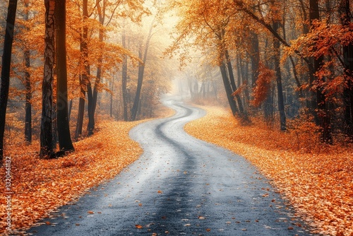 © Photo, Fototapeta premium Serene Winding Road Through Autumn Forest with Vibrant Leaves