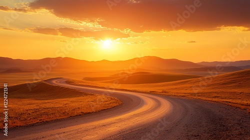 © Adi, Fototapeta premium Serene winding road through golden hills at sunset, with soft clouds and distant mountains