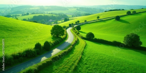 Fototapeta premium Serene Winding Road Through Lush Green Rolling Hills, a Picturesque Pastoral Landscape