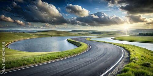 Naklejka premium Serene Winding Road Through Rolling Green Hills and Still Waters at Sunset