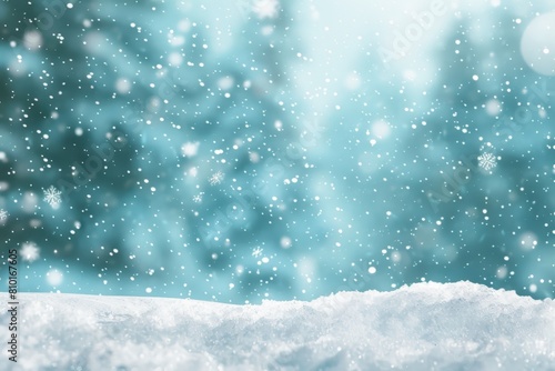 Obraz premium Serene winter background capturing the essence of the season with delicate snowflakes falling gently against a soft, blurred forest backdrop, evoking a peaceful, cold, and tranquil atmosphere
