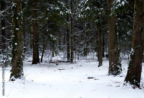 Fototapeta premium Serene Winter Forest: Snow-Covered Trees and Tranquil Landscape