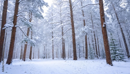 Fototapeta premium Serene winter forest with snow-covered pine trees under a clear sky