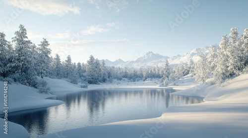 © danadesa, Fototapeta premium Serene winter lake landscape snow covered mountains and trees