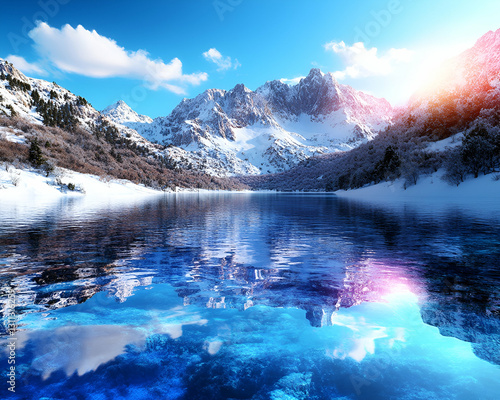 © Supriyono, Fototapeta premium Serene Winter Lake Reflecting Snowy Mountains