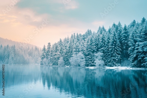 Fototapeta premium Serene Winter Lake with Snow-Capped Trees and Reflections