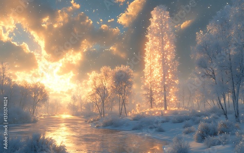 © Asif, Naklejka premium Serene Winter Landscape at Sunset with Glowing Trees and Snow-Covered River