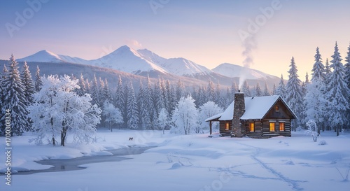 Fototapeta premium Serene Winter Landscape Featuring a Cozy Log Cabin with Lit Windows, Snowy Mountains, and Frosty Trees, Evoking Peace and Solitude