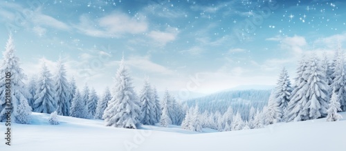 Naklejka premium Serene winter landscape featuring lush snow-covered fir trees on a soft white ground under a bright blue sky with clouds and snowfall elements