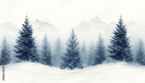 Naklejka premium Serene winter landscape featuring snow-covered mountains and evergreen trees...