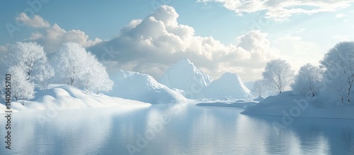 © AbstractAI, Fototapeta premium Serene winter landscape featuring snow-covered trees and a calm reflective lake under a clear blue sky and fluffy clouds