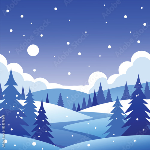 © GraphicRiver99, Fototapeta premium Serene winter landscape illustration featuring a full moon illuminating a tranquil snowy scene under a clear blue night sky