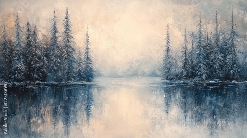 © Zam, Fototapeta premium Serene winter landscape painting of snow-covered trees reflected in a calm lake.