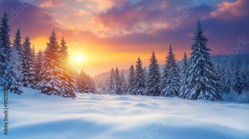 Fototapeta premium serene winter landscape showcasing a snow-covered pine forest with a breathtaking sunset sky, perfect for christmas and new year greetings, radiating peacefulness