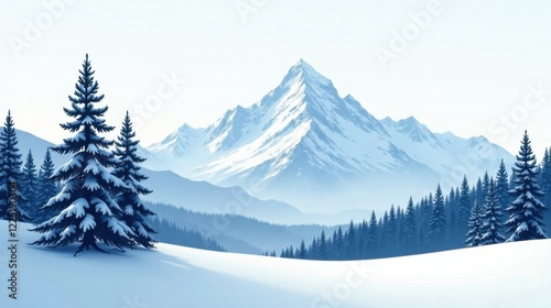 Fototapeta premium Serene Winter Landscape Snow-Covered Evergreens and Majestic Mountain Peaks...