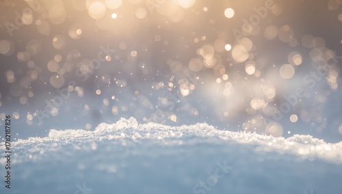 Fototapeta premium Serene winter landscape with gentle snowfall under warm golden light,...