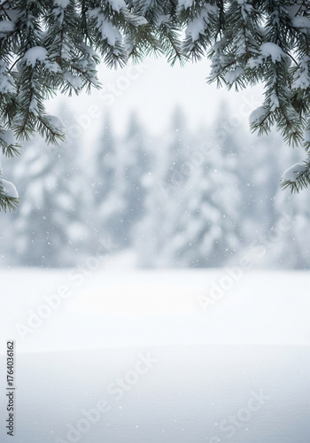 © Anuyj, Obraz premium Serene winter landscape with snow-covered branches and falling snow. Winter christmas background