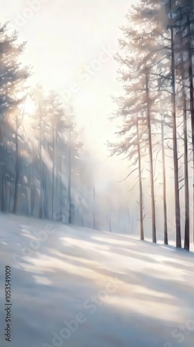 Naklejka premium Serene Winter Landscape with Snow-Covered Pines and Gentle Light Play