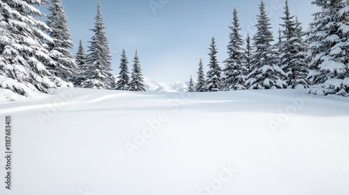 © siraphol, Naklejka premium serene winter landscape with snow covered trees and mountains