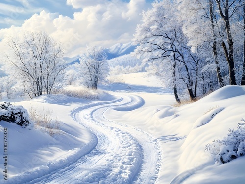 Fototapeta premium Serene winter landscape with snow-covered trees and winding path.