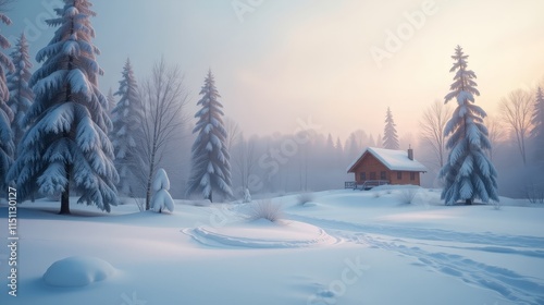 Fototapeta premium Serene Winter Landscape with Snowy Trees and Cozy Cabin Against a Gradient Sky