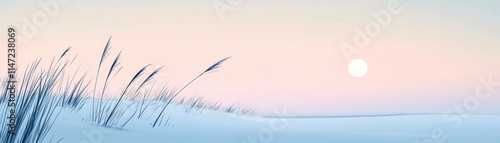 © rioyoungguns, Obraz premium Serene winter landscape with tall grasses and a bright sun in the sky.