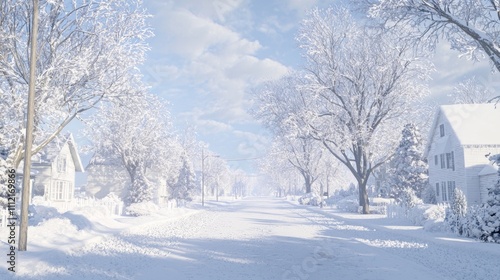 Naklejka premium Serene Winter Morning: Tranquil Street Covered in Fresh Snow - Ultra-Detailed...