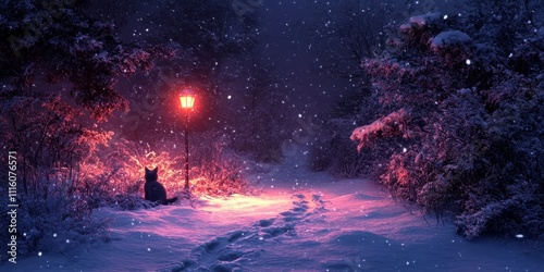Obraz premium Serene winter night with soft snowflakes falling under a glowing lantern in a...