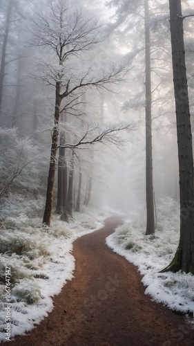 Obraz premium Serene winter path winding through a foggy forest with snow-covered ground and trees