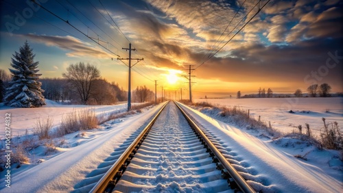 © Wanlop, Fototapeta premium Serene Winter Railway Tracks Stretching Towards the Horizon in a Snow-Covered Landscape with Electric Poles Captured Through Long Exposure Photography
