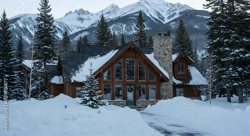 © FIA, Naklejka premium Serene Winter Retreat Stunning Cabin Nestled Among Snow Capped Mountains