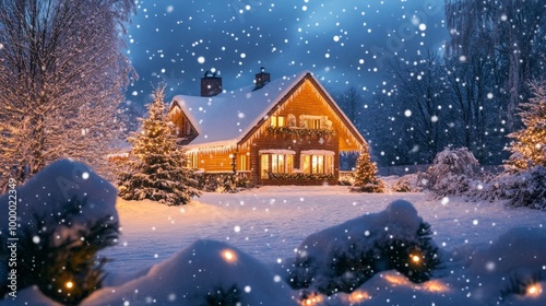 © vetrana, Fototapeta premium Serene winter scene snow covered home adorned with christmas lights on a peaceful night