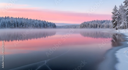 © tinum, Fototapeta premium Serene Winter Sunrise Over a Frozen Lake with Snowy Forest.