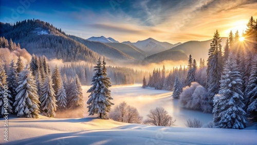 Fototapeta premium Serene Winter Sunrise Over Misty Mountain Lake and Snow Covered Evergreen Forest