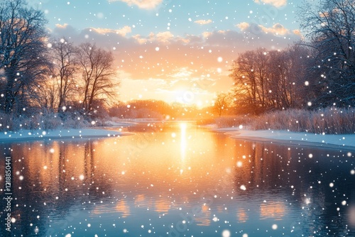 Fototapeta premium Serene winter sunset over a snowy river with falling snowflakes in a tranquil...