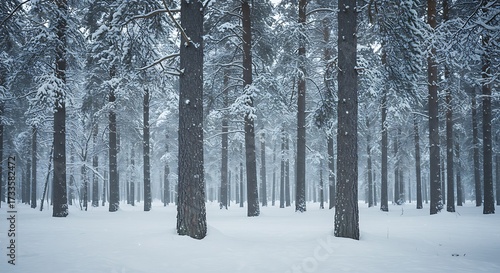 Fototapeta premium Serene winter wonderland: A snow-covered forest scene with tall trees and...