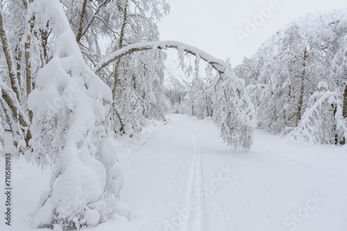 © Alf Terje Vollan, Fototapeta premium Serene Winter Wonderland Featuring a Snow-covered Archway of Trees Over a Path